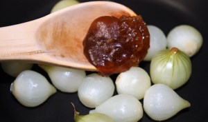 En una sartén sin nada de aceite poner las cebollitas peladas y añadirles una cucharada de miel. Fuego bajo, 3 minutos tapado. No lo perdáis de vista y moverlo constantemente ya que la miel al contener mucho azúcar se quema con facilidad. Reservar en la sartén.