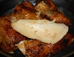 Colocar en una fuente de horno y regar con la mitad del líquido reservado. Meter en el horno precalentado a 180º, 30 minutos. Regar con el líquido y jugo que va soltando la pularda. Otros 30 minutos.