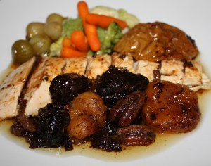 Sacar la fuente con la pularda, por otro lado las verduras, relleno y salsa, todo por separado para que cada uno se sirva lo que quiera.
