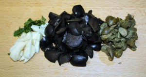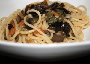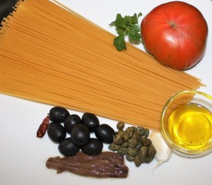 Estos espaguetis están muy buenos y son muy rápidos y fáciles de hacer. Hay muchas maneras de hacerlos pero los ingredientes básicos son las aceitunas negras, alcaparras, ajo y tomate. Después les podéis poner, o no, aceitunas verdes, anchoas, perejil, orégano, guindilla o lo que se os ocurra.