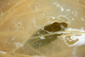 Poner una olla al fuego con agua, una hoja de laurel, una cucharadita de aceite y otra de sal, ponemos poca ya que la salsa contiene ingredientes muy salados. Cuando comience a hervir añadir los espaguetis. 10 minutos. Escurrir.