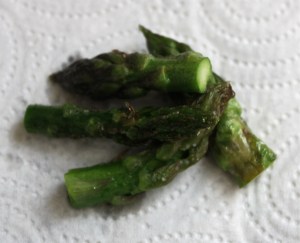En una sartén con las 2 cucharadas de aceite saltear las puntas de los espárragos. Cuando el aceite esté bien caliente ponerlas, bajar el fuego al mínimo y dejar 2 minutos. Salar.