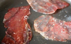 Otra vez en esa misma sartén que ya apenas contiene aceite, dorar el jamón, un trozo por cucharita. Vuelta y vuelta.
