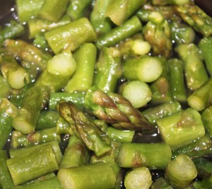 Los tallos y el resto de los espárragos, ya que se suelen vender en manojos, los troceamos, eliminando la parte inferior del tallo que es más dura, y los pochamos en una sartén con aceite, a fuego bajo, tapados durante 6 minutos. Salar.