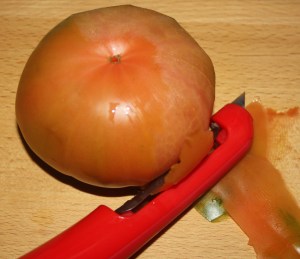 Pelar el tomate. Este pelador de la foto se puede comprar por internet o en tiendas especializadas en cocina. Va fenomenal.