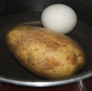 En un cazo con agua y una cucharadita de sal poner a cocer la patata y el huevo, a fuego medio durante 15 minutos. Sacar el huevo a los 10 minutos y dejar la patata 5 minutos más, al pincharla debe estar tierna pero no demasiado para que no se deshaga.