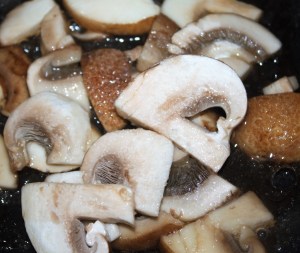 En una sartén con dos cucharadas de aceite 0,4º y dos de vinagre, pochar las láminas de champiñón, a fuego medio. Salar. 3 minutos moviendo.
