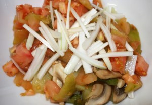 Añadir los dados de tomate y la juliana de cebolleta. Mezclar bien para que todo se impregne del aceite de la sartén.