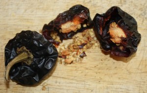 Cortar las ñoras por la mitad y quitarles las semillas.