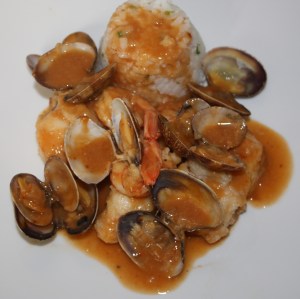 También lo podéis hacer en una cazuelita pequeña como una tapa. En este caso utilizar gambas pequeñas, sacar la molla de la almeja, cortar el rape en dados y poner una bolita de arroz encima. Por lo demás la elaboración es la misma, eso si regar con bastante salsa.