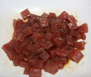 Mezclar la soja, el aceite y el wasabi en un bol. Añadir el atún. Mezclar bien y dejar macerando en la nevera media hora.