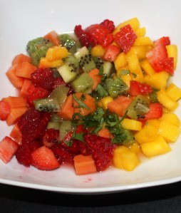 Por otra parte mezclar en un bol las frutas con el perejil picado y el zumo del limón. Mezclar y dejar también en la nevera media hora.