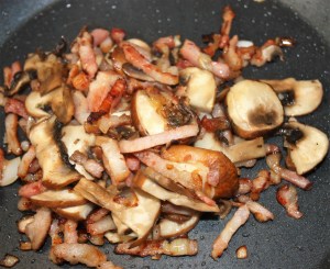 Filetear los champiñones e incorporarlos a la sartén. 3 minutos a fuego medio.