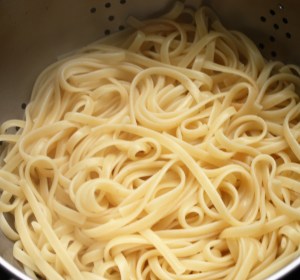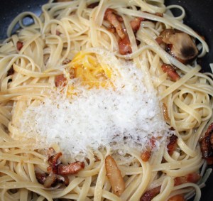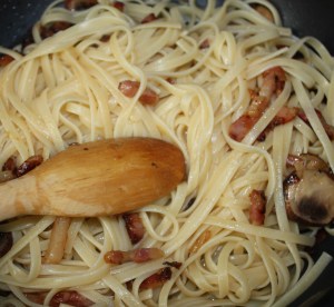 Volver a poner la sartén al fuego y añadir los espaguetis. Remover.