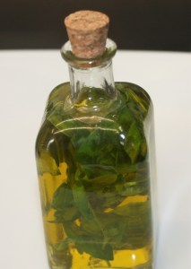 En una botellita poner 250 ml de aceite de oliva virgen extra y las hojas de tres ramas de albahaca. Dejar macerando mínimo tres días.