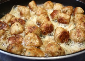 En una sartén con el aceite, a fuego fuerte, doramos las albóndigas. Como están muy blanditas, darles la vuelta con ayuda de dos espátulas o cucharas de madera para que no se os rompan.