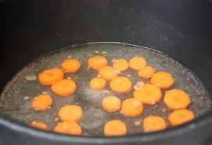 Pelar las zanahorias y cortarlas en rodajas. Añadir a la olla cuando el agua comience a hervir. Bajar el fuego.