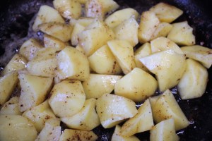 Pelar las patatas y cortarlas en trozos chascándolas. Muy importante chascarlas para que suelten el almidón y nos espesen la salsa.
