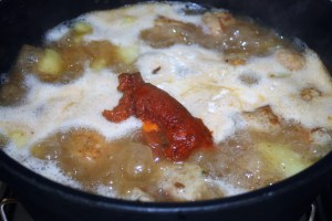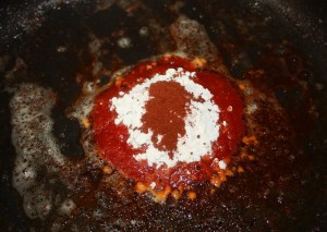 Por último en esa misma sartén añadir el tomate, harina y pimentón. Una vuelta y sacar del fuego ya que tanto la harina como el pimentón se queman con mucha facilidad.