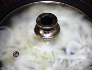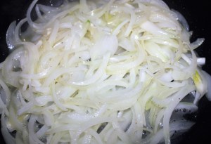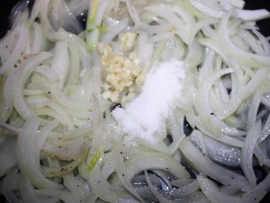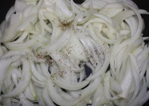Cuando se funda la mantequilla, añadir las cebollas cortadas en juliana. Fuego fuerte.