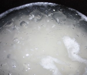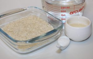 Poner en un bol el arroz con agua. Ir moviéndolo con las manos para que desprenda el almidón, igual que se hace en el arroz para sushi. Esto se hace para que el arroz nos salga suelto y no se apelmace. Como veréis el agua se pone blanquecina. Cambiar el agua y repetir la operación hasta que el agua salga transparente.