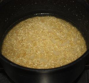 Cuando comience a hervir añadir la quinoa y cocer a fuego medio-bajo, tapado, 20 minutos.