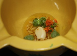 SALSA PESTO: en un mortero majar los piñones, 8 hojas de albahaca, el ajo, ralladura de naranja, una pizca de sal y 3 cucharadas de aceite virgen extra.