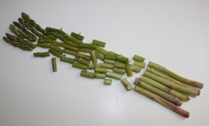 Lavar los espárragos y cortar en trozos pequeños, eliminando el final del tallo que es más duro y reservando las puntas para decorar.
