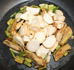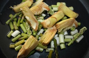 Poner al fuego una sartén amplia con 6 cucharadas de aceite 0,4º. Saltear los ajos tiernos, trozos de alcachofa y espárragos. 3 minutos a fuego medio. Sacar las puntas de espárragos y reservarlas.
