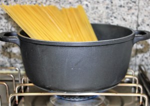 Cocer la pasta en una olla con una cucharadita de sal. En cuanto el agua comience a hervir añadir los espaguetis. Seguir las instrucciones del fabricante ( se suelen cocer al dente en 10 minutos ).