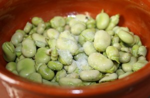 En una cazuela honda de barro, o la que tengáis, rehogar las habas con 4 cucharadas de aceite, tres de agua y media cucharadita de sal, fuego medio.