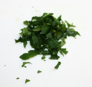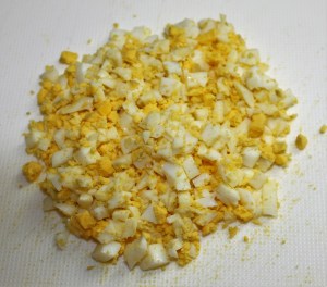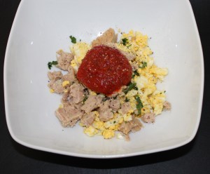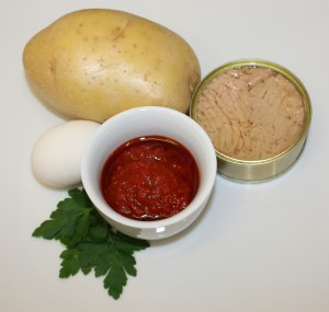 Poner en un bol el huevo picado, el atún, el perejil y dos cucharadas de tomate frito. Salpimentar.