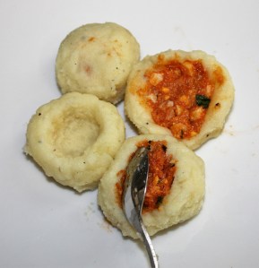 Con un dedo hacer un agujero en el centro y rellenarlo con una cucharadita de la pasta de atún, huevo y tomate.