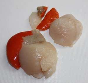 Separar de la vieira el medallón blanco de la parte que contiene el coral naranja y una parte marrón. Cortar la parte marrón y desecharla.