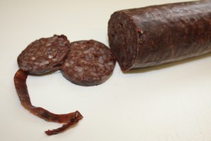 Cortar dos rodajas de morcilla y quitarles la piel.