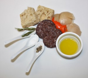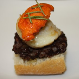 Colocar sobre el pan una rodaja de morcilla, encima el medallón de vieira y sobre él el coral. Terminar con unas hojas de romero, unas gotas de aceite virgen extra y unas escamas de sal.