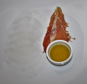 Sacar los vasos de la nevera y colocar encima el paquetito de obulato con jamón.