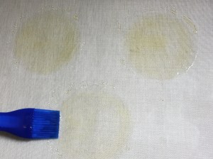 Poner tres obleas sobre un papel de horno, hoja de silicona o silpat. Pintar con aceite. No se aprecian demasiado en la foto pero ahí están.