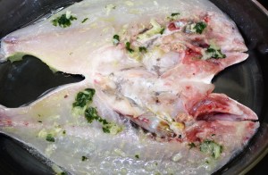 Colocar el besugo abierto, con la piel hacia abajo, en una fuente de horno con 6 cucharadas de aceite en la base de la fuente. Verter encima el majado y dejar macerando 1 hora en la nevera.