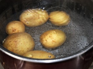 …cocerlas con piel, en agua con una cucharadita de sal hasta que estén tiernas al pincharlas, unos 15 minutos desde que el agua comienza a hervir.
