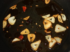 En una sartén con 4 cucharadas de aceite dorar los otros 2 ajos pelados y láminados y las guindillas partidas en dos. Si no os gusta mucho el picante, quitar las semillas. Cuando el ajo comience a dorarse sacar del fuego y añadir el vinagre. Cuidado puede saltar!!!!