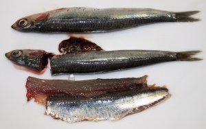 Cortar la cabeza y la cola. Con un cuchillo eliminar las tripas, presionando con cuidado para que salgan, pero sin romper los lomos. Con el dedo pulgar separar un lomo con mucho cuidado, siguiendo la espina. Estirar la espina, otra vez con mucho cuidado y ya tendremos los dos filetes.
