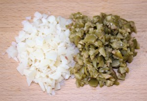 Picar el queso y las aceitunas, no muy pequeño para que se noten los trozos.