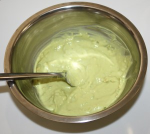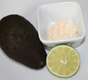 Sacar la carne del aguacate, machacar con un tenedor y mezclar con la mayonesa y el zumo. Reservar en la nevera.