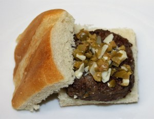 Tostar el pan. Colocar un poco de cebolla frita, la hamburguesa y encima de ella los trocitos de queso y aceituna reservados.