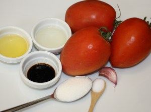Colocar en una fuente de horno los tomates con las láminas de ajo encima y regar con los aceites y el vinagre. Añadir encima la sal y el azúcar. 15 minutos.