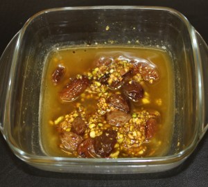 Hacer una vinagreta con los pistachos, aceite, vinagre, miel y sal. Añadir las pasas y reservar en la nevera.
