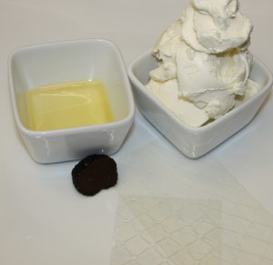 Cortar media trufa en láminas y añadirla al queso. La otra media reservarla para la vinagreta.