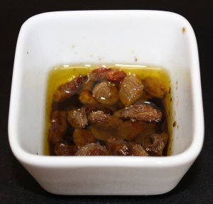 Hacer la vinagreta con el aceite, miel, trufa y sal. Añadir las pasas para que se hidraten.