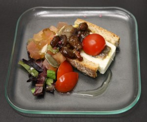 Poner a los lados del rectángulo de queso las tiras de pan, pegadas a los bordes del queso. Encima media anchoa, medio cherry y por los lados los cherrys cortados en cuartos, brotes, tomate a dados y frutos secos. Aderezar todo con la vinagreta….. Y…..LISTO!!!!